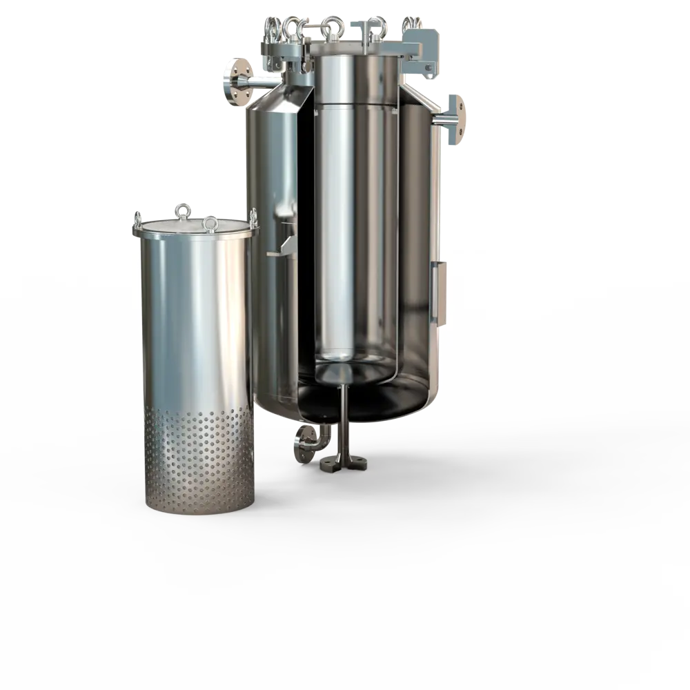 Das Medium wird zunächst in verschiedenen Stufen über die drei Beutelfiltergehäuse, bis auf 25 µm, vorfiltriert. Hier kommen ausgekleidete Edelstahlsiebkörbe zum Einsatz.