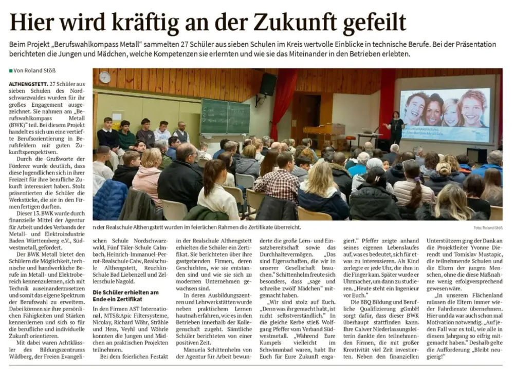 Klasse aus dem gesamten Landkreises Calw. In Kooperation mit regionalen Industrie- und Handwerksunternehmen der Metallbranche bekommen die Teilnehmenden wertvolle Einblicke in gewerblich-technische Ausbildungsberufe und können ihre Fähigkeiten in praxisorientierten Projekten vertiefen.